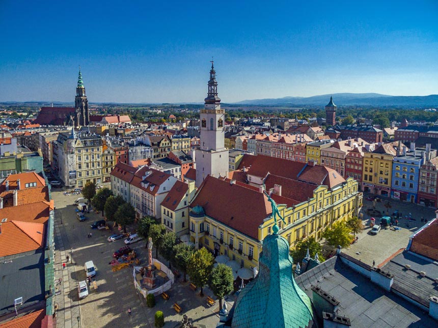 The market square and tower in Swidnica, Poland